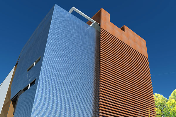 Fassaden teilweise massiv und geschlossen – Beton + Leichtbaukonstruktionen mit Belägen aus Alucopond oder ultra thin high performance concrete, bzw. transparente Metall-Glaskonstruktionen unter Einsatz von hochwertigen Sonnenschutzglas und Beschattungssystemen in Kombination mit Passivenergieelementen.