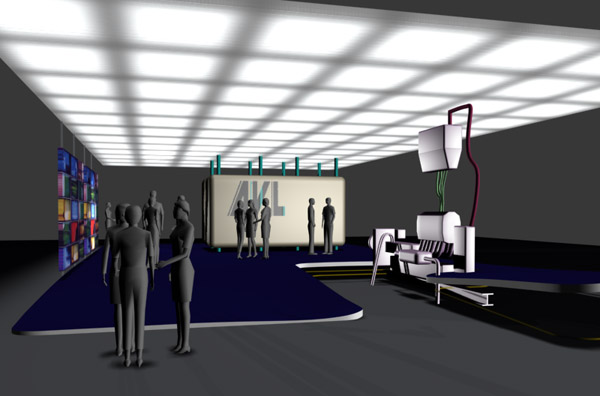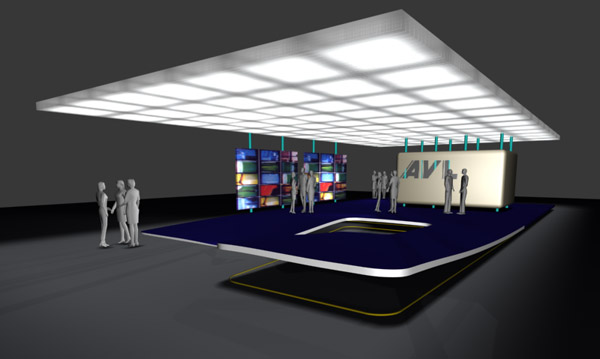 >> Die Beleuchtung wird abhängig von den audiovisuellen Projektionen eingesetzt. Sie ist kombinierbar zu verwenden und beeinflußt das Gesamtbild des Standes.