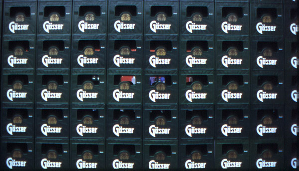 'Kleincontainer' werden in doppelter Stapelung zu einer räumlichen Einheit zusammengesetzt - um als Gesamtes wieder zur Bierkiste, zum Identifikationsobjekt des Produktes zu werden.