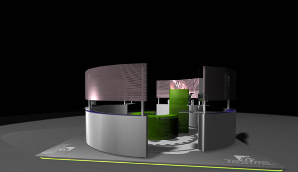 In Ergänzung mit einem technoiden Beleuchtungssystem vermittelt sich der Stand selbstbewusst als Repräsentant eines international tätigen High-Tech Konzerns.