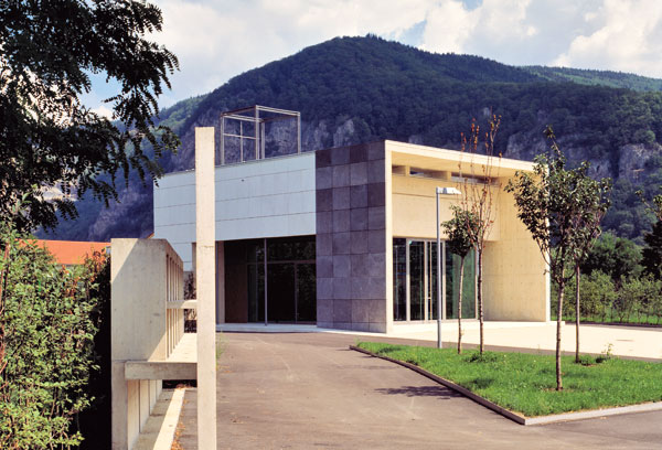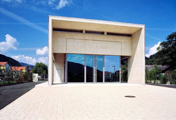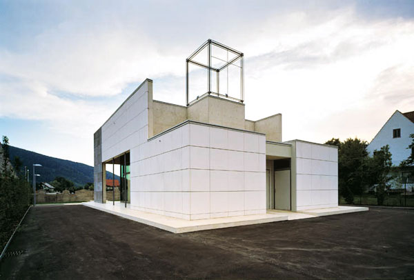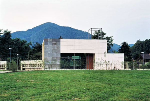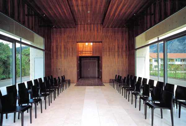 Diese neue Leichenhalle ist mit dem vorgelagerten Platz und dem Prozessionsweg zur Mitte der Anlage hin konzipiert.