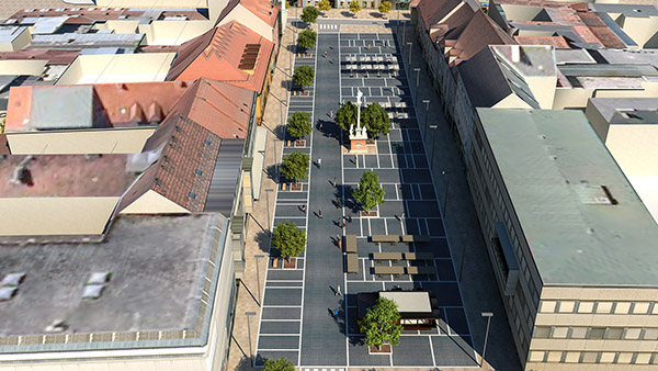 Zwecks Homogenität ist die mit einem Raster/Plattenformat versehene Feldteilung quer über den Platz gelegt, auch über Fahrspur und Parkierung. Funktionell und standortbezogen wird der gesamte Längsbereich von Norden, nach Süden als Aktivzone gesehen, auch mit den vorhandenen Elementen Marien-Denkmal, Baumbestand, neu platziertem Gastro-Stand.