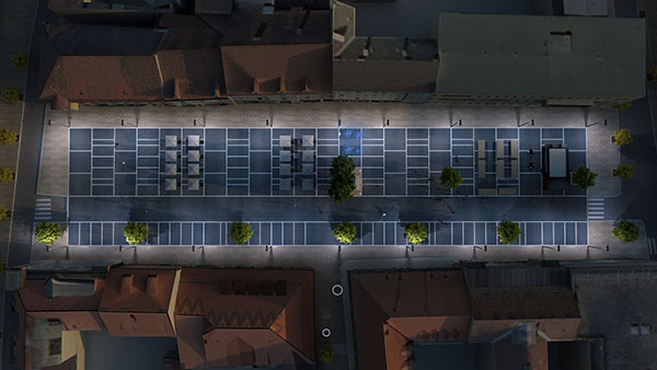 Um den neu gestalteten Kernbereich für seine Stadtbewohner auch bei Nacht sicher und attraktiv erlebbar zu machen wird ein modernes dynamisches Beleuchtungs-system – Smart Light – entlang der Gehbereiche eingebaut. Adaptive, ökonomische Lichtsteuerung, benutzerstromabhängig, bedeutet beacht-liches Einsparpotenzial gegenüber Dauerausleuchtung. Das Lichtkonzept sieht an den Plätzen entlang der Längsseiten als Hauptlichtpunkte hochwertige, blendfreie Mastleuchten vor, ergänzt um parzielle Fassaden-beleuchtungen und individuelle, indirekte Bodenstrahler bei den Sonderfunktionen - Wasserspiel, Marien-Säule, tw. Baumstandorte – Aufmerksamkeitsbereiche. Entlang den Strassenzügen werden generell abgespannte Hängelampen zur Ausleuchtung montiert – Vorteil freier Strassenquerschnitt, und im Bereich von Kreuzungen/Übergänge leuchtdichtemässig verstärkt – Sicherheit, Aufmerksamkeit.