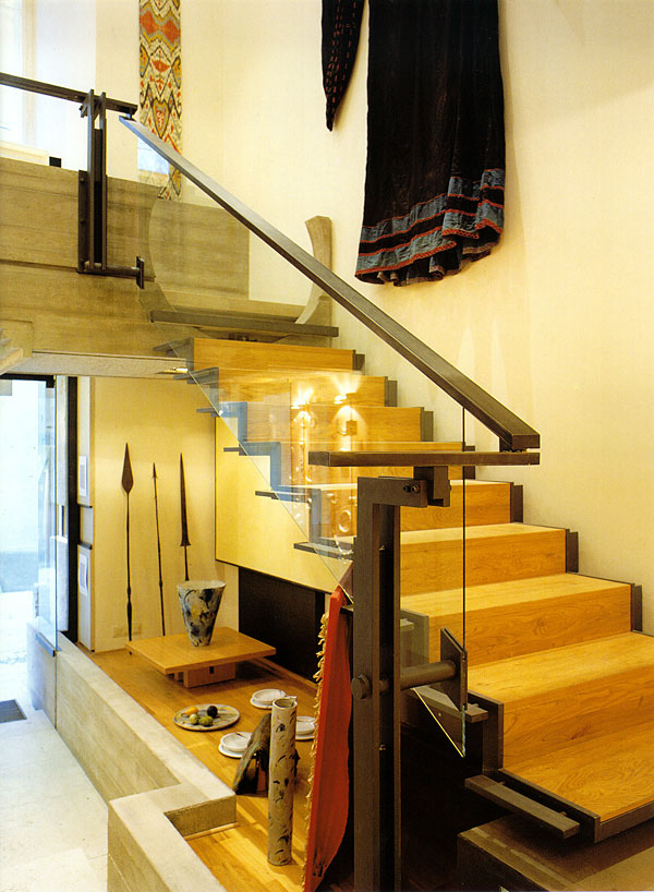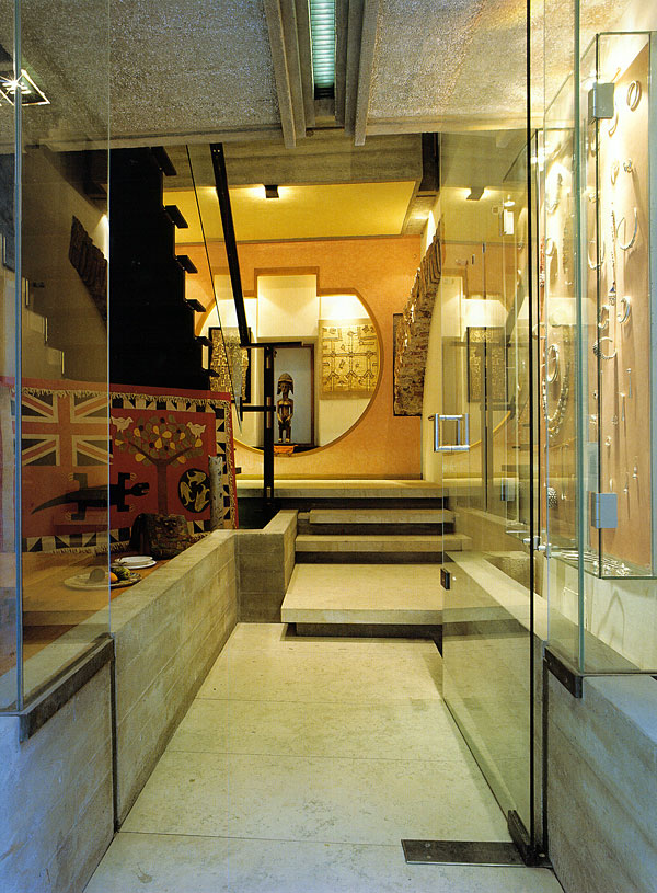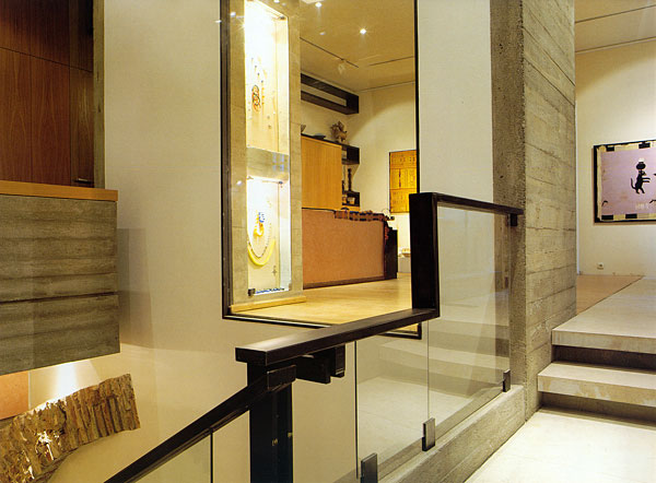 Die zweigeschossige Erschliessung mit dem angesetzten "Weg" ist Herzstück der Galerie. Das Portal ist Schwelle, Tor, und Vitrine in einer Funktion. Die "Spange" über Kopf - Richtungspfeil, Schutzschild und Wappen.