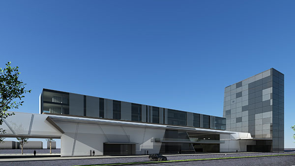 Als Grundidee wird die vorhandene Baumasse mit einer L-förmigen Grossform überlagert, die auch den städtebaulichen Abschluß zum näheren Umfeld darstellt. Über das angestrebte Volumen wird das Objekt selbst zum Landmark am südlichen Stadteintritt.