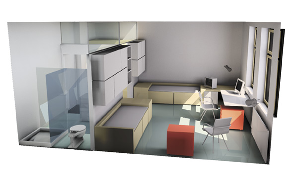 Die sofortigen baulichen Massnahmen intensivieren Bereiche ähnlicher Nutzung. Bewusst wurde versucht 89 Zweibettzimmer mit inkludierten Nasszellen unterzubringen. Im zentralen Bereich des bestehenden Stiegenhauses wurden grosszügige WC-Anlagen angeordnet.