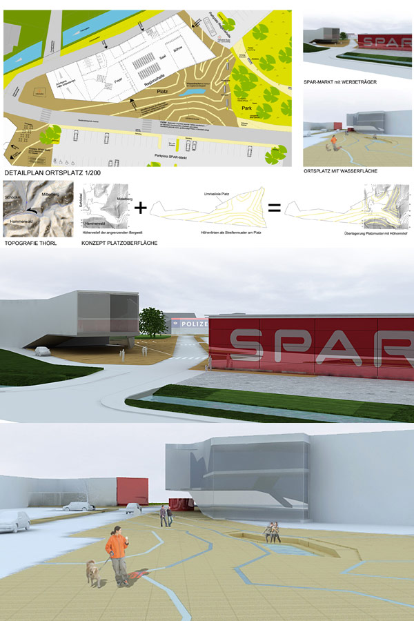 Entsprechend der topografischen Entwicklung der angrenzenden Berge (Mitterberg, Hammerwald und Schöckel) ergibt sich das „neue Zentrum Thörl", in der Mitte des westlichen Grundstückteils. (siehe Diagramme Zentrumsbildung)