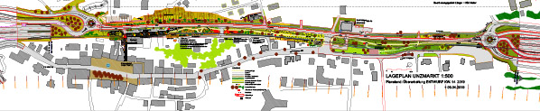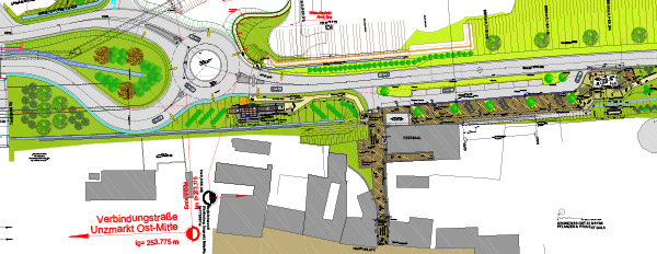 Grosszügige gestaltete Flächen mit eingefärbten FT.-Betonplatten verbindet als gedachte „Spange" beide Strassenseiten.