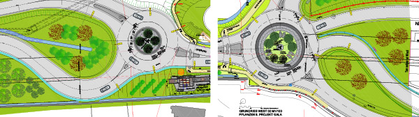 Der Kreisverkehrs in Ortsmitte wird als Equivalent zum Gestal-tungsvorschlag am Ortsrand – westlicher, grosser Kreisverkehr, hier mit Gesteinsring - ebenfalls skulptural definiert – beleuchteter StahlRing mit innerer Baumpflanzungen. Damit wird der Endpunkt des Naturpfades markiert und dem Ort ein unverkennbares Zeichen verliehen, das tagsüber als dynamiche und nachts als leuchtende Scheibe in Erscheinung tritt.