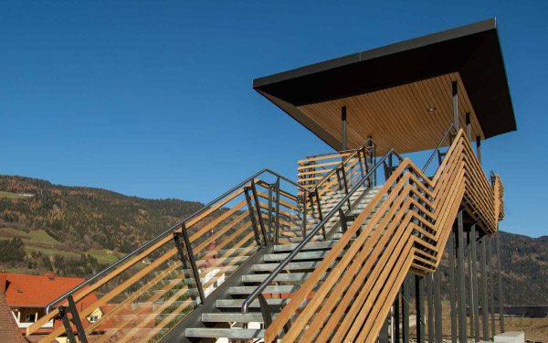 Auf der gegenüberliegenden, dem Ort zugewandten Strassen-seite setzt sich die Spange materialgleich fort und wird zum grosszügigen Schwellenbereich von Gemeindeamt und Dorf-schule.
