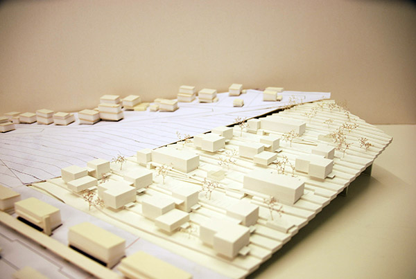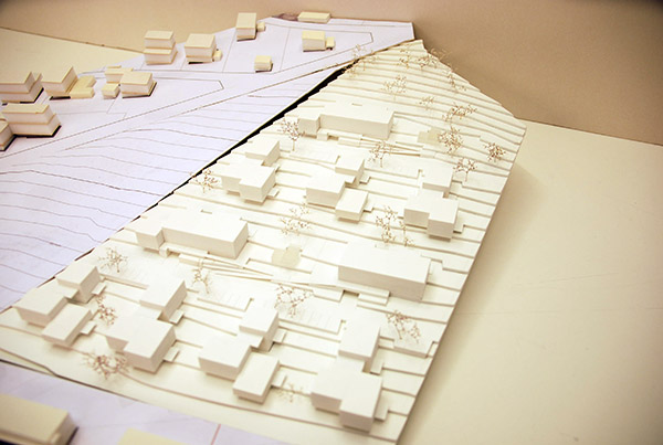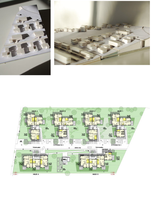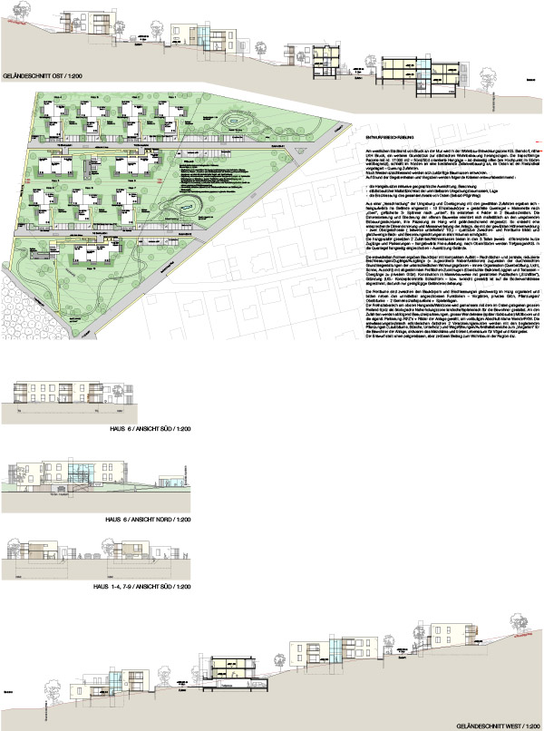 Aus einer „Verschneidung“ der Umgebung und Überlagerung mit den gewählten Zufahrten ergeben sich - hangaufwärts ins Gelände eingesetzt - 10 Einzelbaukörper = gestaffelte Querriegel + Maisonette nach „oben“, gefächerte 3- Spänner nach „unten“. Es entstehen 4 Felder in 2 Bauabschnitten. Die Dimensionierung und Gliederung der offenen Bauweise orientiert sich maßstäblich an den umgebenden Bebauungsstrukturen, ihre Plazierung im Hang wird geländeschonend eingesetzt. So entsteht eine entsprechende Dimensionierung und Massenverteilung der Anlage, die mit der gewählten Höhenentwicklung - zwei Obergeschosse ( teilweise unterkellert/ TG.) - qualitative Zwischen- und Freiräume bildet und gleichwertige Blick- und Besonnungsrichtungen in allen Volumen ermöglicht. Die hangparallel gesetzten 2 Zufahrten/Wohnstrassen bieten in den 3 Teilen jeweils Zugänge und Parkierungen – hangabwärts Frei-aufstellung, nach Oben/Süden werden Tiefgaragen/KG. in die Querriegel hangseitig eingeschoben – Ausnützung Gelände.