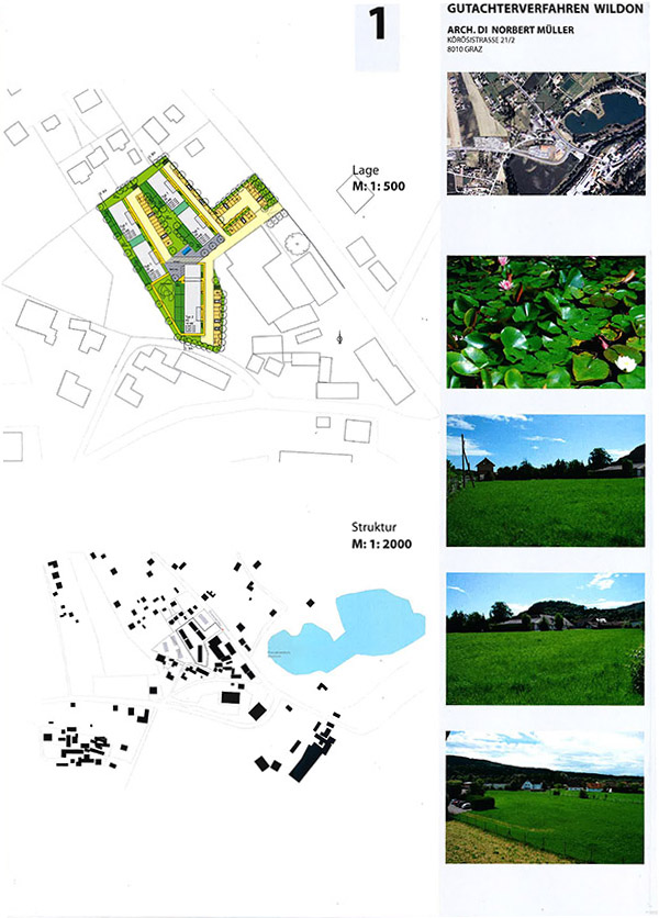 Die momentan noch ungenutzte, begrünte Fläche ist an der Nordostseite durch einen vorgelagerten Grundstückteil rund 30 m von der Grazerstrasse entfernt – Lärm/ Pufferzone - dieser Bereich wird für die PKW- Aufstellung genützt, inklusive Grün/Schallfilter – und wird über eine Servitutsstrasse/Hofzufahrt aufgeschlossen. Das Areal wird im Südosten durch grössere Baumassen und die Grazerstrasse begrenzt – Gasthaus, Gewerbehof, nördlich davon befinden sich Einfamilienhäuser, nach Westen öffnet sich der Grund in noch freies Gelände – möglichre Erweiterung. Diesen vorhandenen, teils amorphen Umgebungselementen wird nun ein neuer Schwerpunkt entgegengesetzt – auf Grund der möglichen Dichte urban angelegt. So soll mit der Baumassenverteilung bzw. Gebäudestellung eine Überlagerung von örtlicher Signifikanz und ländlicher Ungestörtheit erreicht werden, ein unverwechselbares Quartier mit hoher Lebensqualität und starkem Image.