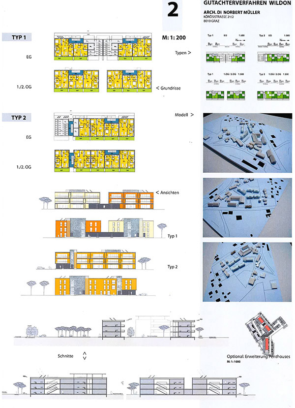 Mit nur 2 Haustypen und 4 verschieden grossen Grundrissen + Sonderformen wird das Auslangen gefunden – über entsprechende Freibereiche – Balkone, Terrassen werden die Wohnungen an die attraktiven grünen Innenbereiche angebunden ( im Erdgeschoß Privatgärten). Als zusätzliches Gestaltungselement sind bei den einzelnen Freibereichen (Terrassen, Loggien) vertikale „Klammern“ an den Fassaden hochgezogen – Nutzung Volumen als zusätzlicher Stauraum pro WE. möglich.